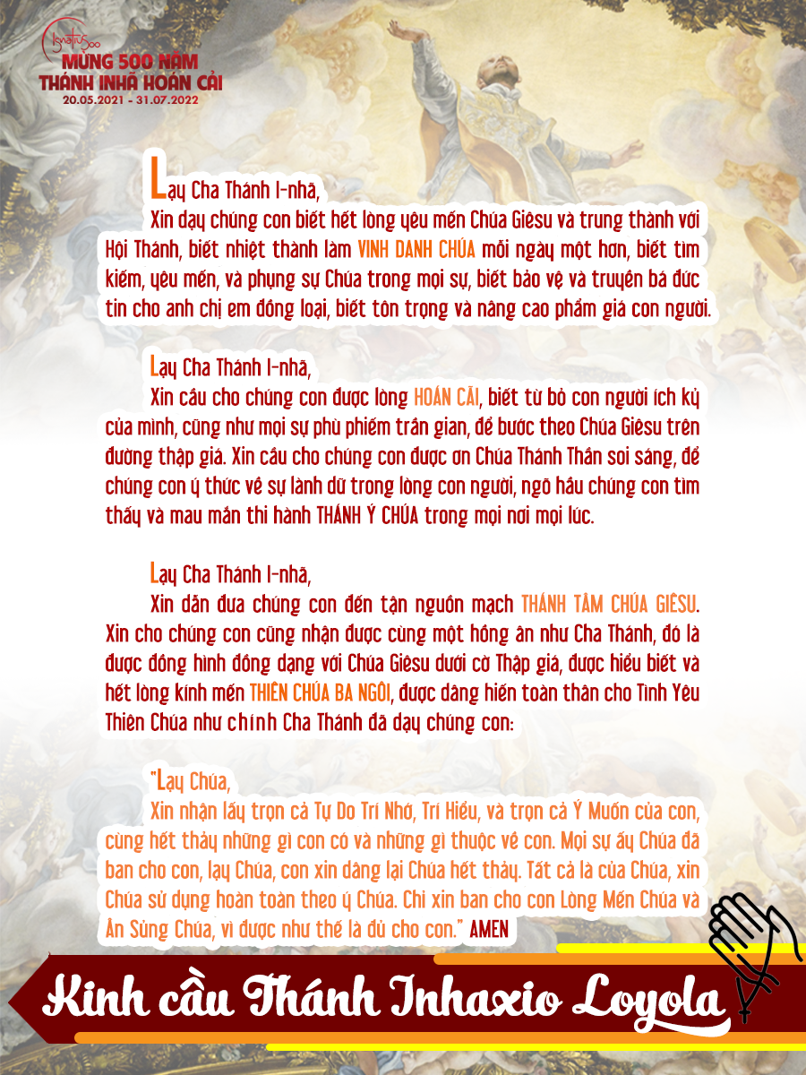 Lạy Cha Thánh I-Nhã, Xin cầu cho chúng con được lòng HOÁN CẢI,/ biết từ bỏ con người ích kỷ của mình,/ cũng như mọi sự phù phiếm trần gian,/ để bước theo Chúa Giêsu trên đường thập giá./ Xin cầu cho chúng con được ơn Chúa Thánh Thần soi sáng,/ để chúng con ý thức về sự lành dữ trong lòng con người,/ ngõ hầu chúng con tìm thấy và mau mắn thi hành THÁNH Ý CHÚA trong mọi nơi mọi lúc./