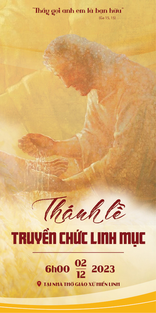 Thánh lễ Truyền Chức Linh Mục sẽ được cử hành vào lúc 06g00 sáng thứ Bảy ngày 02 tháng 12 năm 2023 tại nhà thờ giáo xứ Hiển Linh – Dòng Tên – 19 Đường 5, Khu phố 2, P. Linh Trung, Thủ Đức, Tp. HCM.