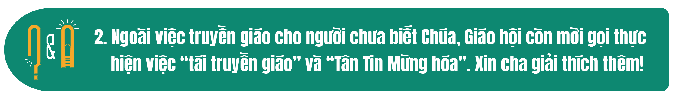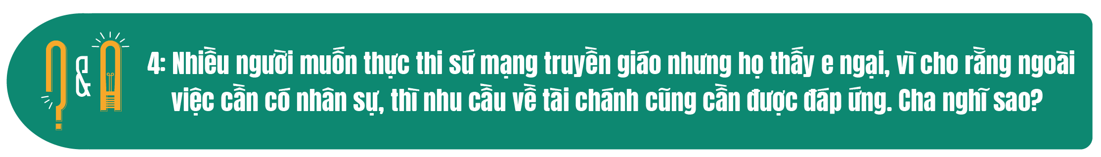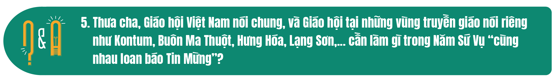 Trả lời: Năm sứ vụ – “cùng nhau loan báo Tin Mừng” – có thể gọi là năm truyền giáo (Mission), tức là truyền giáo bằng hành động cụ thể. Vấn đề cần đặt ra cho mọi thành phần dân Chúa là có bao nhiêu người đang thao thức hoặc thổn thức trước sứ mạng đặc thù này? Nếu không có sự thổn thức để loan báo Tin Mừng thì những lời mời gọi trong Năm Sứ Vụ hiện nay sẽ chỉ là những khẩu hiệu sáo rỗng mà thôi.