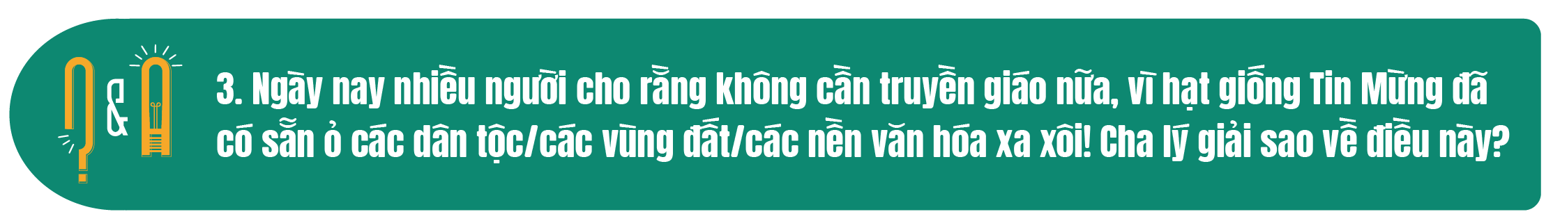 Trả lời: Đúng là nhiều vùng đất, nhiều nền văn hóa đã có hạt giống Tin Mừng hoặc có sự tương giao giữa Tin Mừng và văn hóa của họ. Chẳng hạn như, trong văn hóa và truyền thống của bà con sắc tộc ở Gia Lai và Kon Tum có văn hóa rượu ghè. Ghè rượu cứ đổ nước vào rồi hút nước lên thì nước đó thành rượu, và điều này có nét gì đó giống phép lạ “biến nước lã thành rượu ngon” của Chúa Giêsu ở tiệc cưới Cana (x. Ga 2:2-11). Hay trong tôn giáo, niềm tin vào “vạn vật hữu linh” (Animism) của bà con sắc tộc thiểu số cũng diễn tả niềm tin của Công giáo vào các thiên thần bản mệnh. Các thiên thần che chở cho con người trên mọi nẻo đường hoặc các ngóc ngách của cuộc sống. Tuy nhiên, thiên thần không phải là Chúa. Vì lẽ đó, bà con sắc tộc vẫn hoang mang, lo sợ đủ điều. Họ chưa thực sự tìm được sự giải thoát ở giữa cuộc sống bình yên và bằng lòng với thực tại. Họ là những người tự do tự tại, chẳng lo lắng cho ngày mai, ngày nào được ăn no là vui rồi. Họ sống lời kinh Lạy Cha, và cả lời khuyên Phúc Âm khá tốt: