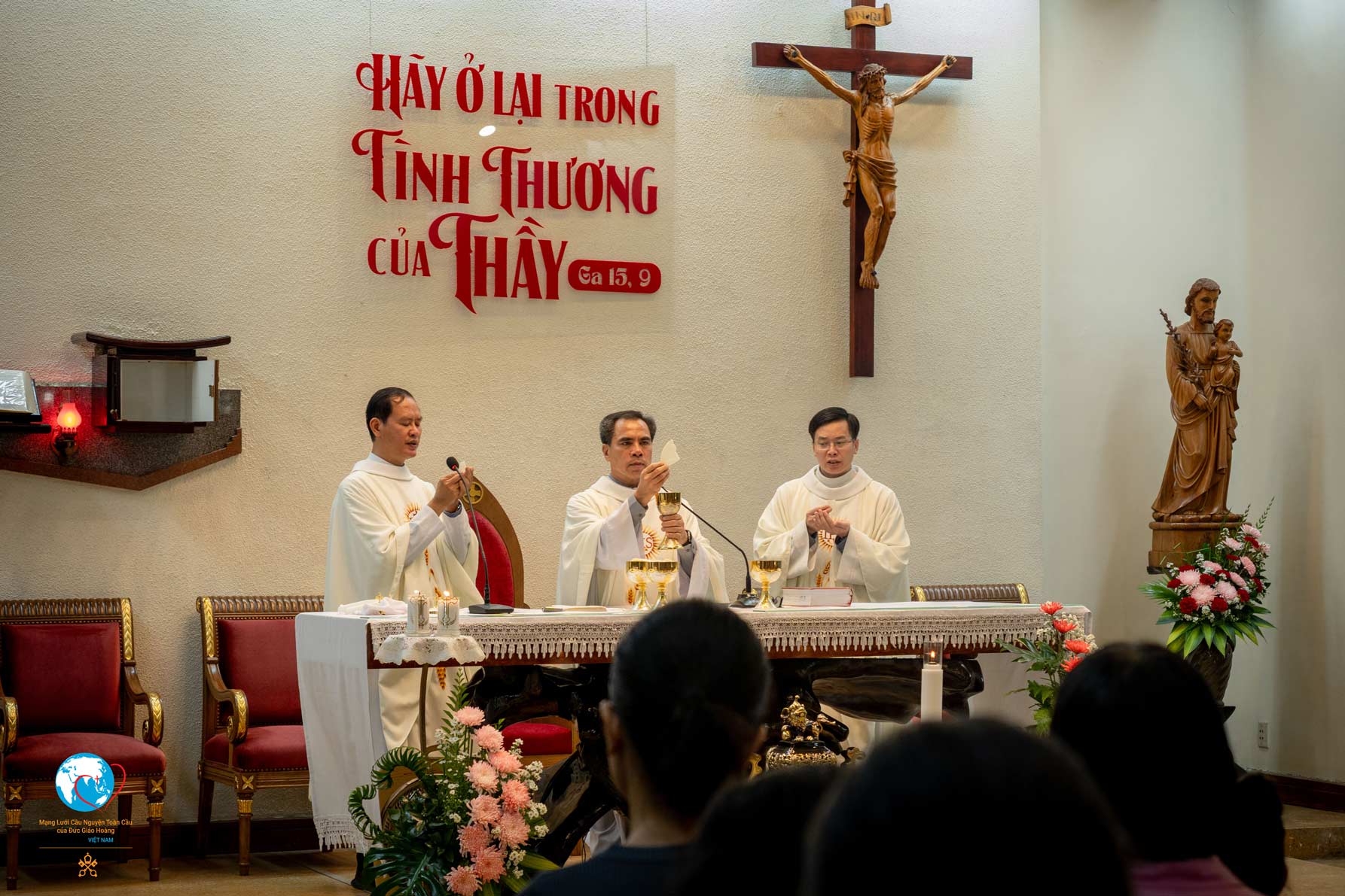 Thánh lễ khai mạc do cha Phêrô Nguyễn Đức Trí, S.J. - Chánh xứ Hiển Linh chủ tế, đồng tế với ngài có cha Tôma Vũ Ngọc Tín, S.J. - Giám đốc Mạng lưới Cầu nguyện và cha Phêrô Nguyễn Văn Hòe, S.J. - Phó xứ Hiển Linh.